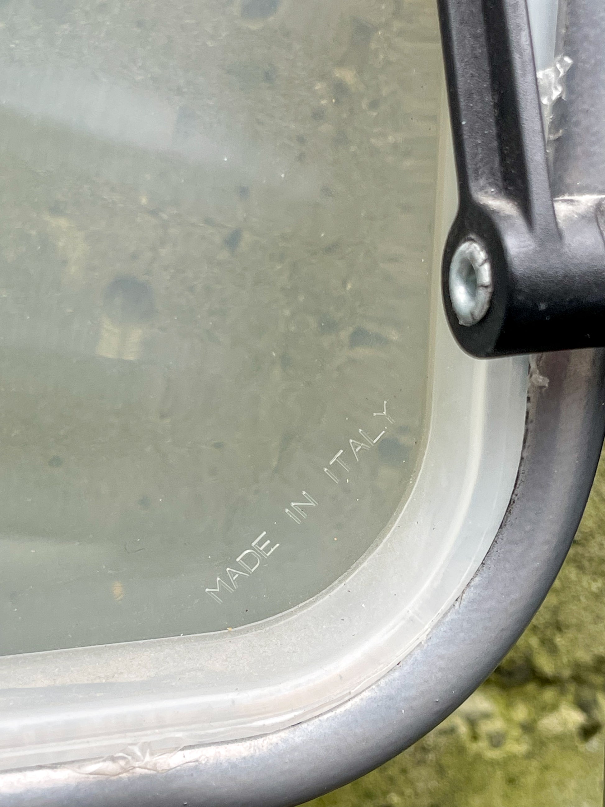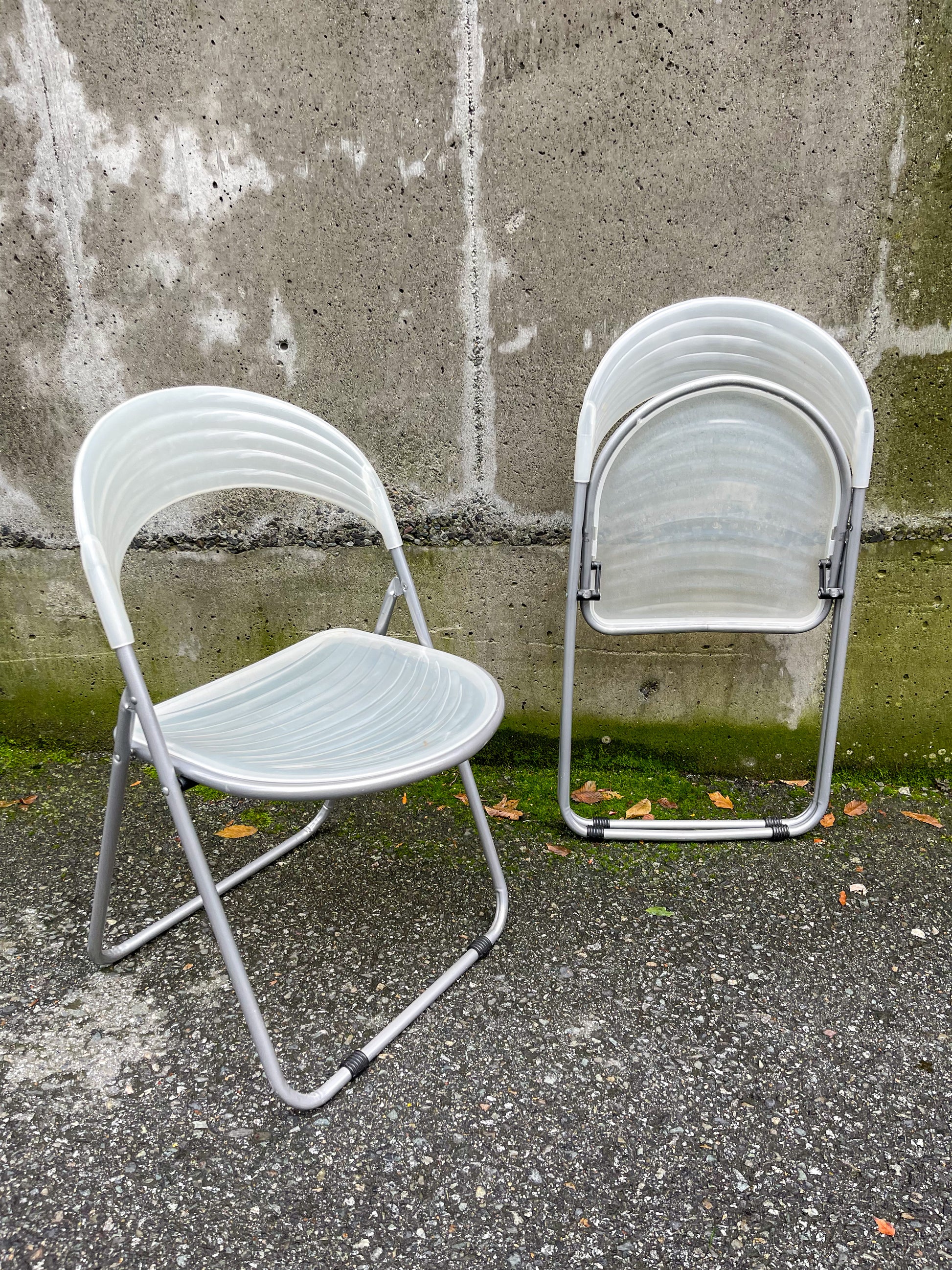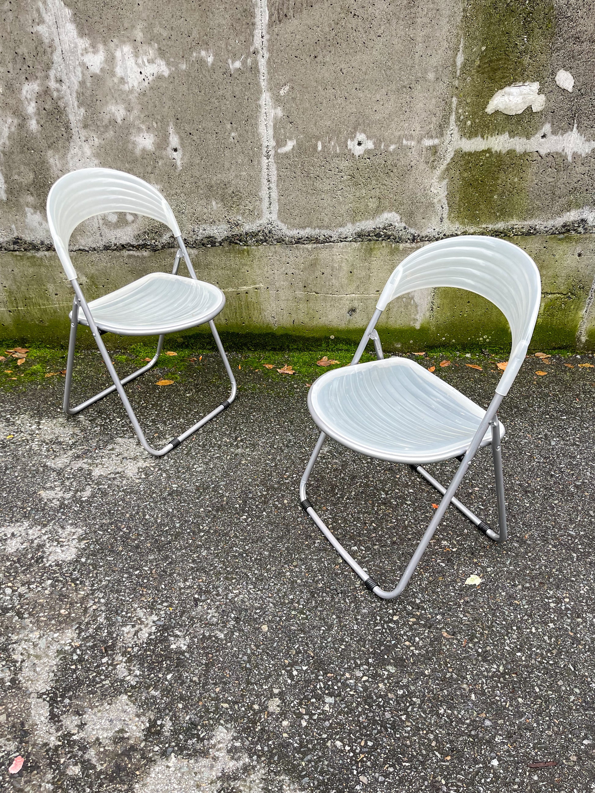 Fun pair of folding chairs by Studio G.P. Italian made, aluminum frames with scalloped translucent plastic seat and back. Price is for the pair